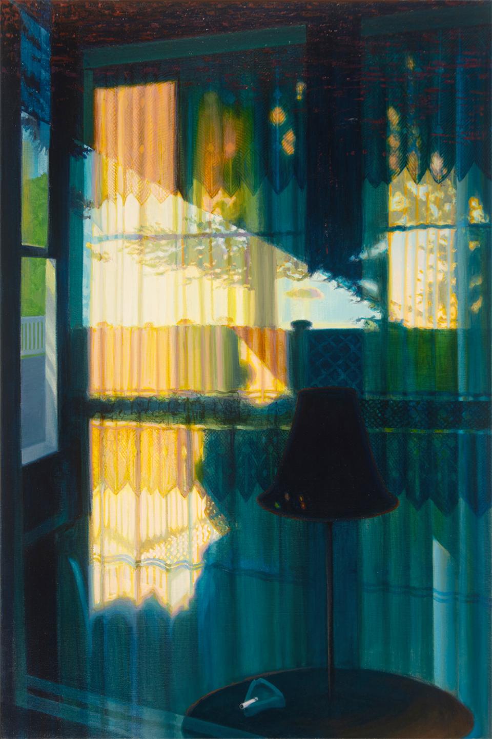 This painting depicts the view of two corner windows in the interior of a home. The right window is covered with a lace curtain and fills the majority of the composition. A small angled window to the left cast a bright ray of light onto the neighboring window, creating glowing abstracted patterns in ochers, greens, cyans and blues as it illuminates the lace. The silhouette of a round end table with a lamp and ashtray are layered on top.