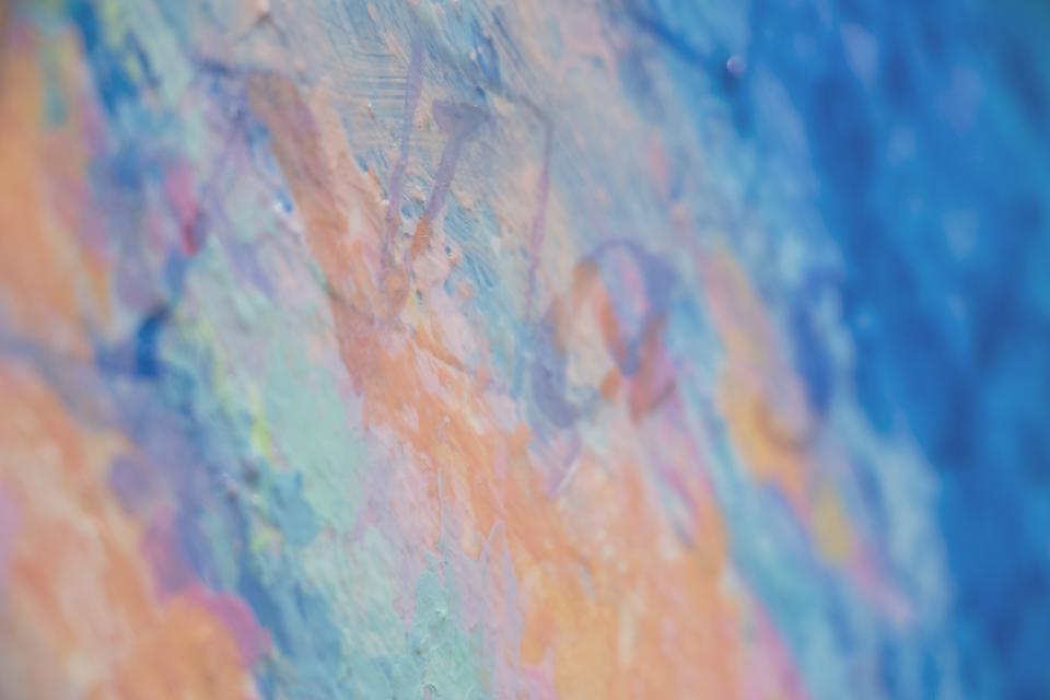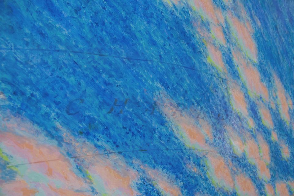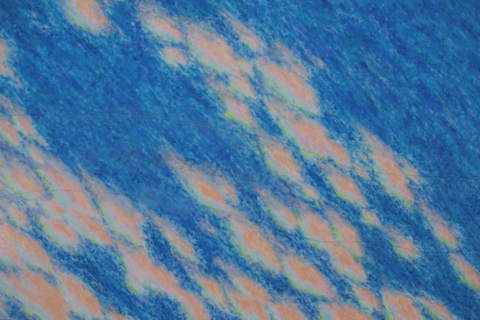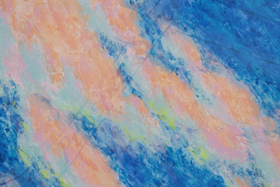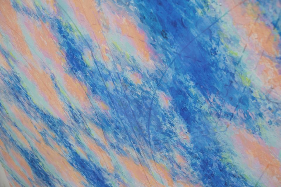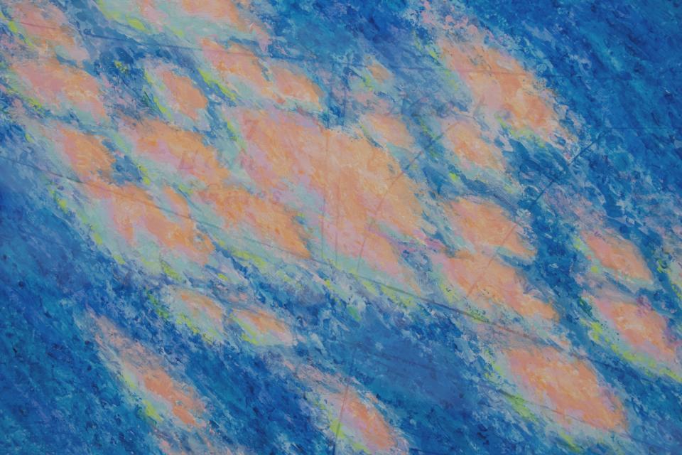 This painting depicts clouds and blue sky reflected on a stretch of ocean, rendered in layered marks of paint applied in blurred palette knife strokes. The painting is photographed where it hangs on the wall of the lobby of the Watermark West apartment building. Clicking on the image reveals detail photographs that show close-ups of the playfully expressionist, palette-knife loads of paint splayed across the canvas to create what come together, seen from a distance, to look like sky reflected on water. These close-ups also reveal that faint traces of an old map of Cambridge at the Charles River can be seen through the paint surface.