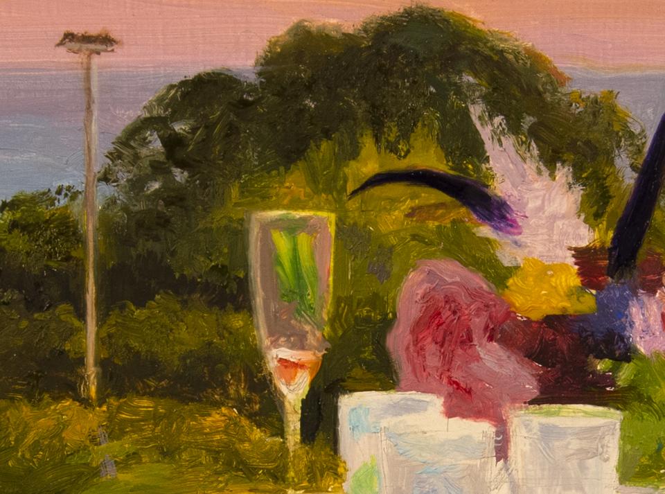 Tinted by the warm sunset, a tabletop wrapped in a gathered white cloth holds a scattering of half-full glasses of drinks, most of them in a pink hue from the same spectrum as the sun-blushed sky above the ocean in the background. Two tall wine glasses and darkest purple feathers of a floral arrangement counterpoint the trees and osprey nest on a tall pole banding the middle background with a bright green lawn inbetween, flanked by a bush of hot red flowers on the left and dark green branches from a classical stone urn on the right.
