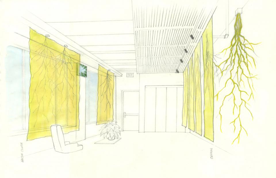 We took the idea of roots quite literally, to surround you in roots, made with electrically charged wires that glow. They’re dipped in resin and spread on sheer fabric hanging in the windows and mounted on the back wall. In front of that wall hangs another layer of sheer fabric, in several draped panels. On them the roots are drawn in phosphorous ink, interspersed with lines of text drawn from the patients and doctors about their experiences, their discoveries and their tips on staying strong.