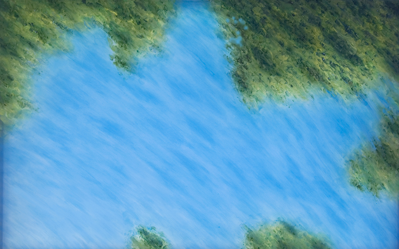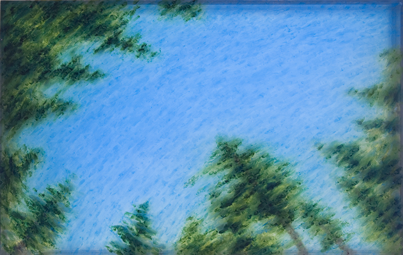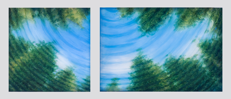 The installation is like a three dimensional grotto that kaleidoscopes as you walk past the windows, or through the room. High on the walls and columns of the gallery are paintings on light boxes that show views up through water to the trees and sky above. These were painted on several layers of Plexiglas within each lightbox, so they too have a depth that subtly kaleidoscopes as you walk about, that accentuates the depth of that water and the rippling of the image seen through the water. So depth is a motif here, creating an environment that envelopes the viewer, that embraces you in an imagined world below ground, executed in gauzy fabric, pale phosphorous ink calligraphy and subtle glowing lines of light that reach out in organic ways beyond you and around you.